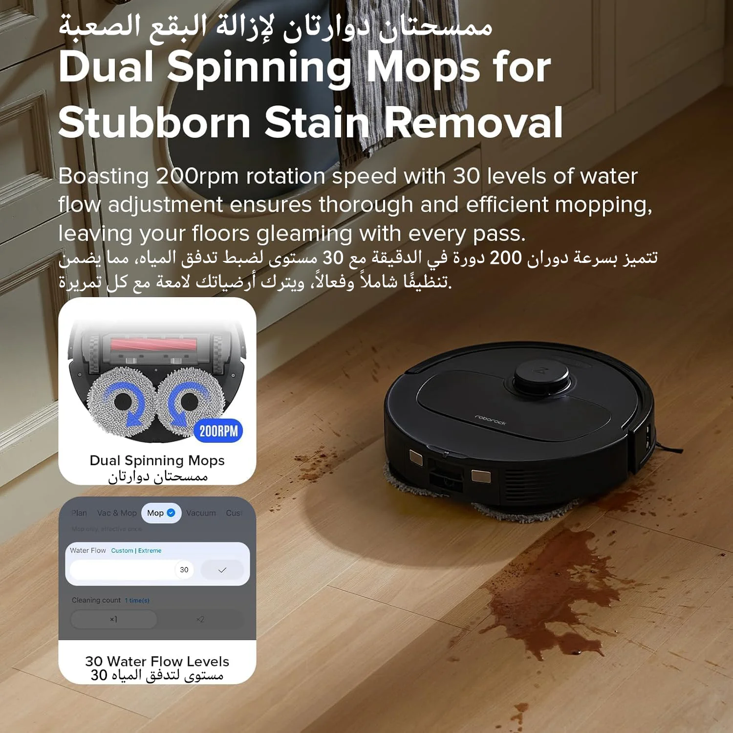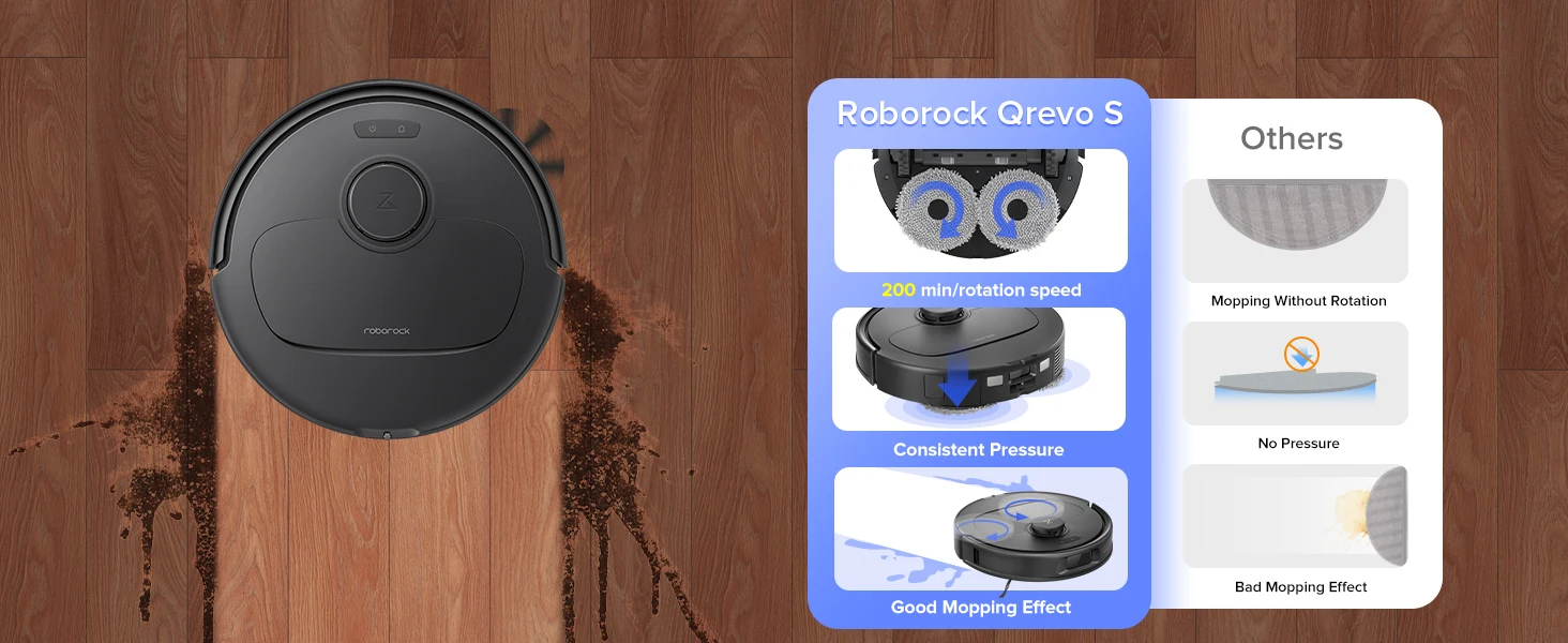 تعمل Roborock Qrevo S بسرعة مذهلة تبلغ 200 دورة في الدقيقة، وهي تتعامل بفعالية مع كل شيء بدءًا من انسكابات الصودا وحتى الفوضى الجافة، مما يوفر أرضيات أصلية مع كل تمريرة.بفضل 30 مستوى لتدفق المياه قابل للتعديل، يمكنك تخصيص كثافة التنظيف في التطبيق لتتناسب مع أنواع الأرضيات الخاصة بك بشكل مثالي، مما يحقق أفضل النتائج في كل مرة.
