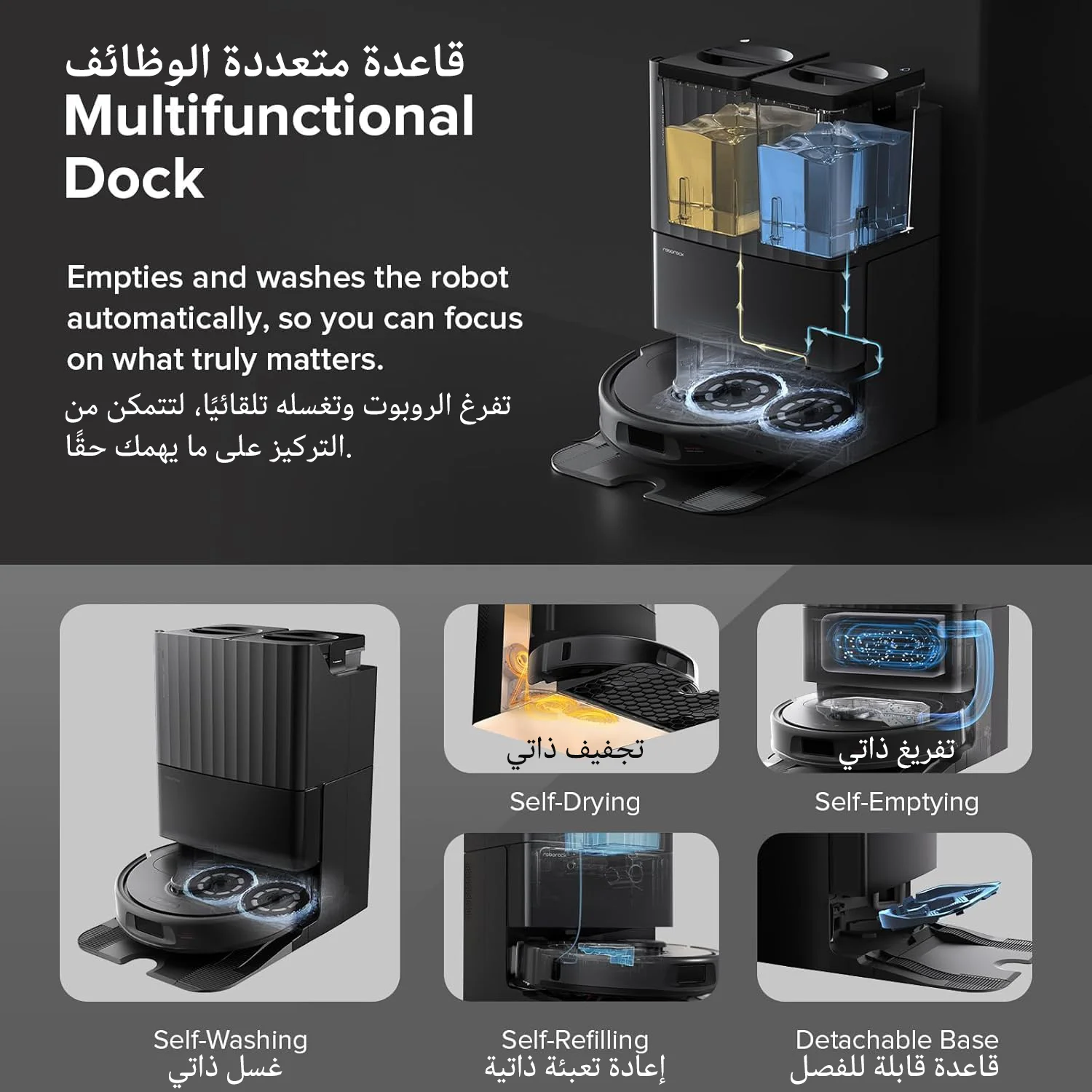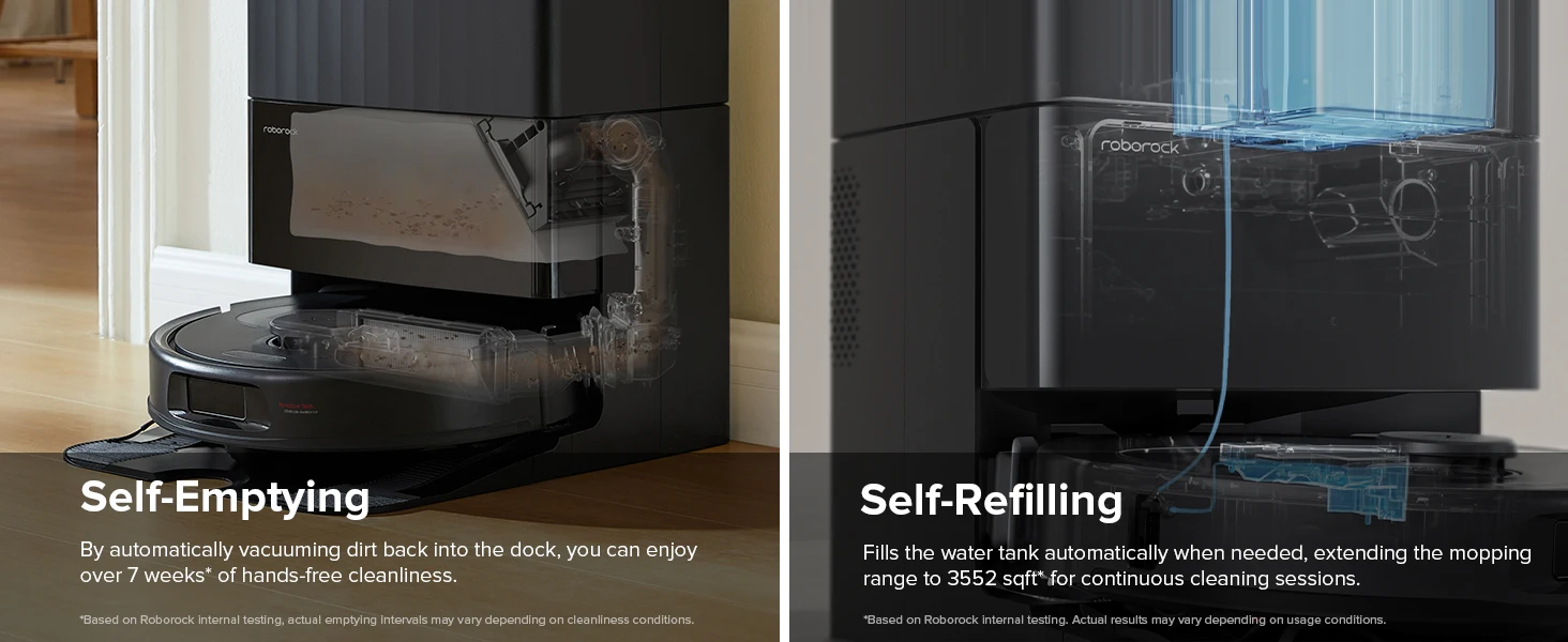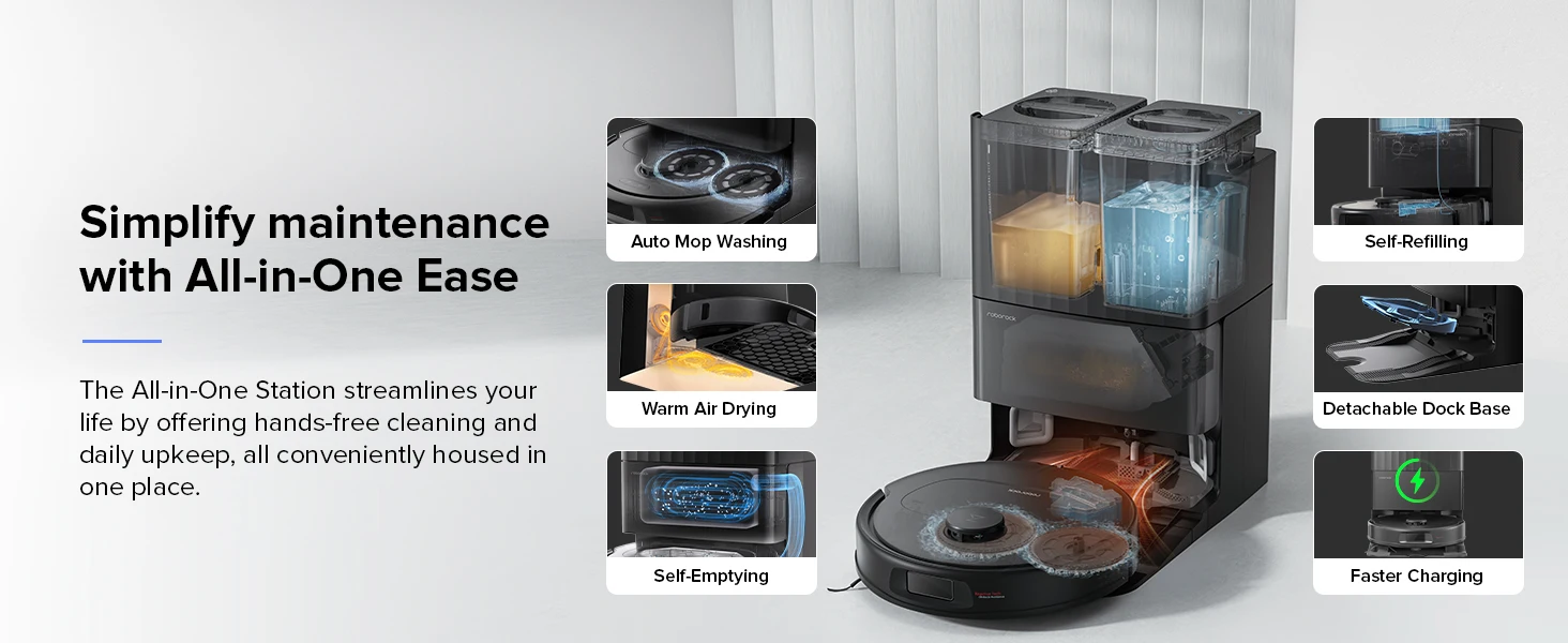 قم بتبسيط روتين التنظيف الخاص بك باستخدام القاعدة متعددة الوظائف.استمتع بصيانة خالية من المتاعب مع ميزة الغسيل التلقائي بالمسح، مما يلغي الحاجة إلى الفرك اليدوي.امنع الروائح الكريهة باستخدام التنظيف بعد التجفيف بالهواء الساخن، مما يضمن منزلًا منعشًا باستمرار.يقوم خزان المياه سعة 5 لتر بإعادة ملء خزان الروبوت بسهولة، ويغطي مساحة مسح واسعة تصل إلى 4305 قدمًا مربعًا.استفد من التشغيل بدون استخدام اليدين لمدة تصل إلى 7 أسابيع بفضل قدرته على التفريغ الذاتي.بالإضافة إلى ذلك، فإن قاعدة الرصيف القابلة للفصل بسهولة تسهل التنظيف الشامل عند الضرورة، مما يوفر لك أقصى قدر من الراحة.