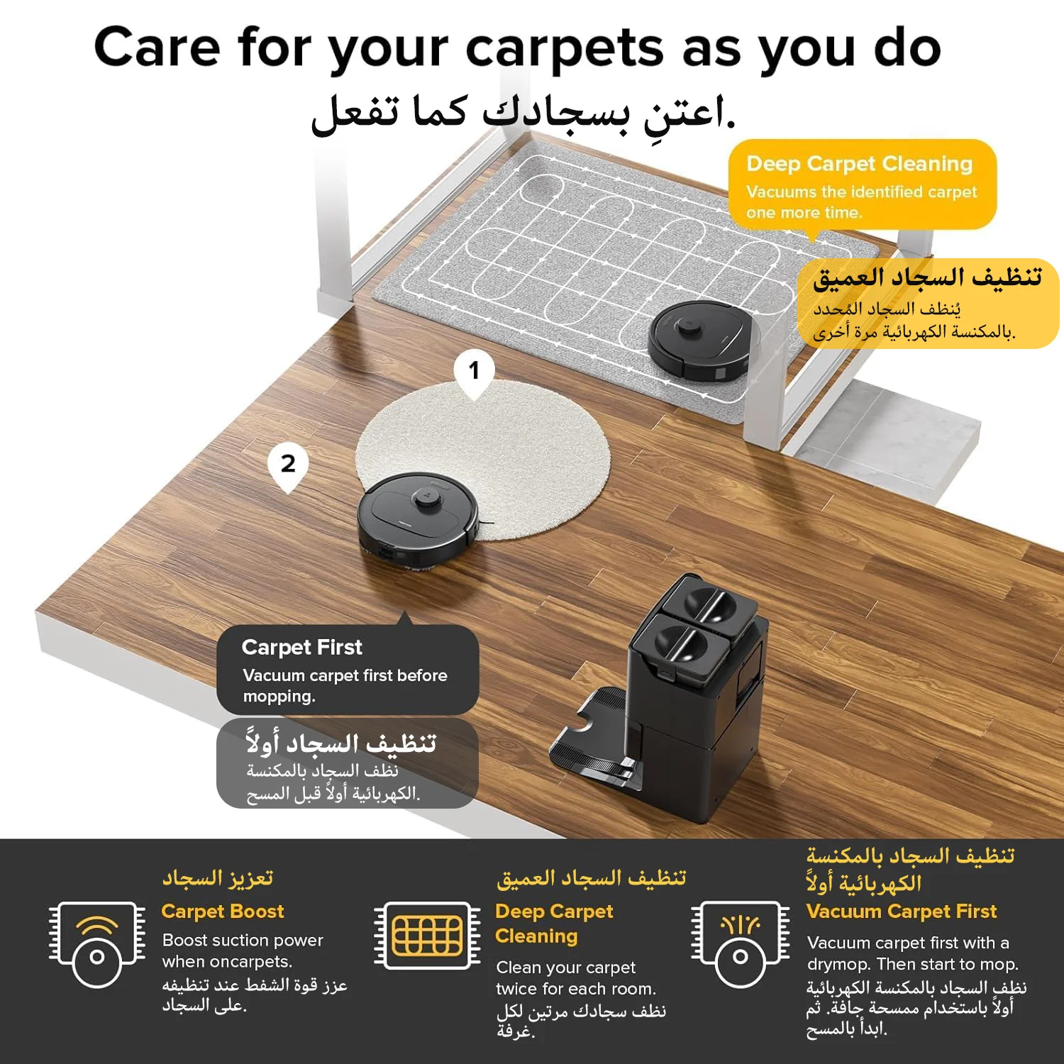 باستخدام خوارزميات الذكاء الاصطناعي المتطورة، فإنه ينظم جلسات تنظيف أكثر ذكاءً وخالية من التوتر. يمكنك التنقل بسلاسة في السيناريوهات غير المتوقعة بفضل ميزات مثل التنظيف المؤقت والقفز، مما يضمن كفاءة متواصلة. توفر استراتيجيات السجاد المخصصة والمناطق المعقودة الذكية حلول تنظيف مخصصة تتكيف مع التصميم الفريد لمنزلك. يدعم رسم الخرائط متعدد المستويات ما يصل إلى 4 مستويات من حفظ الخرائط. استمتع بمستقبل تنظيف المنزل من خلال التحكم المتقدم في تطبيق Roborock.