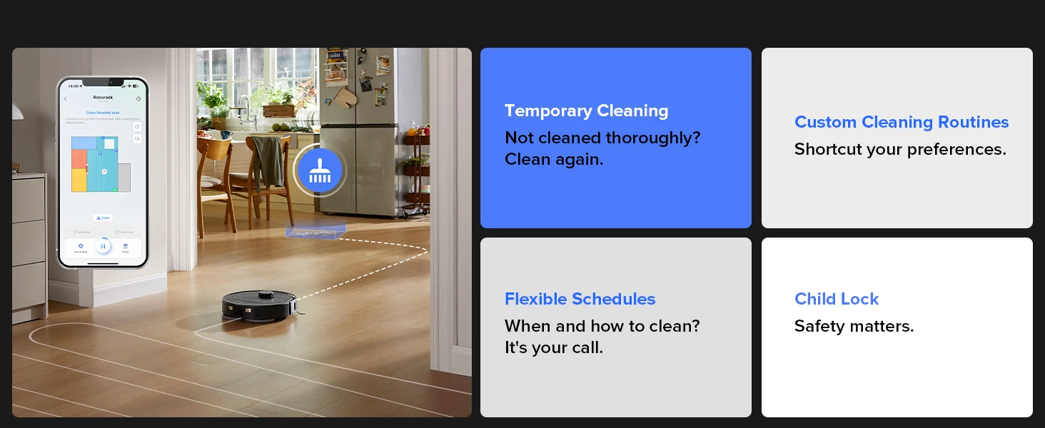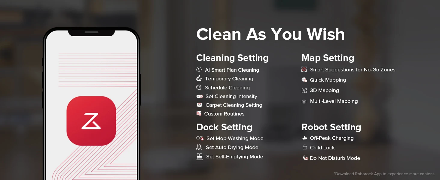 Utilizing cutting-edge AI algorithms, it orchestrates smarter and stress-free cleaning sessions. Seamlessly navigate unexpected scenarios with features like temporary cleaning and skipping, ensuring uninterrupted efficiency. Tailored carpet strategies and intelligent restricted areas offer personalized cleaning solutions that adapt to your home's unique layout. Multi-level mapping supports up to 4 levels of map saving. Embrace the future of home cleaning with Roborock's advanced app control.